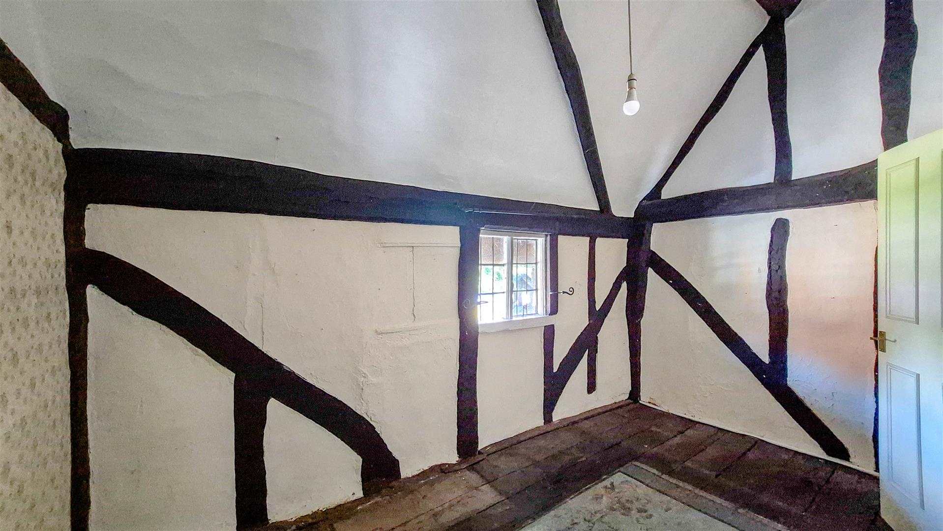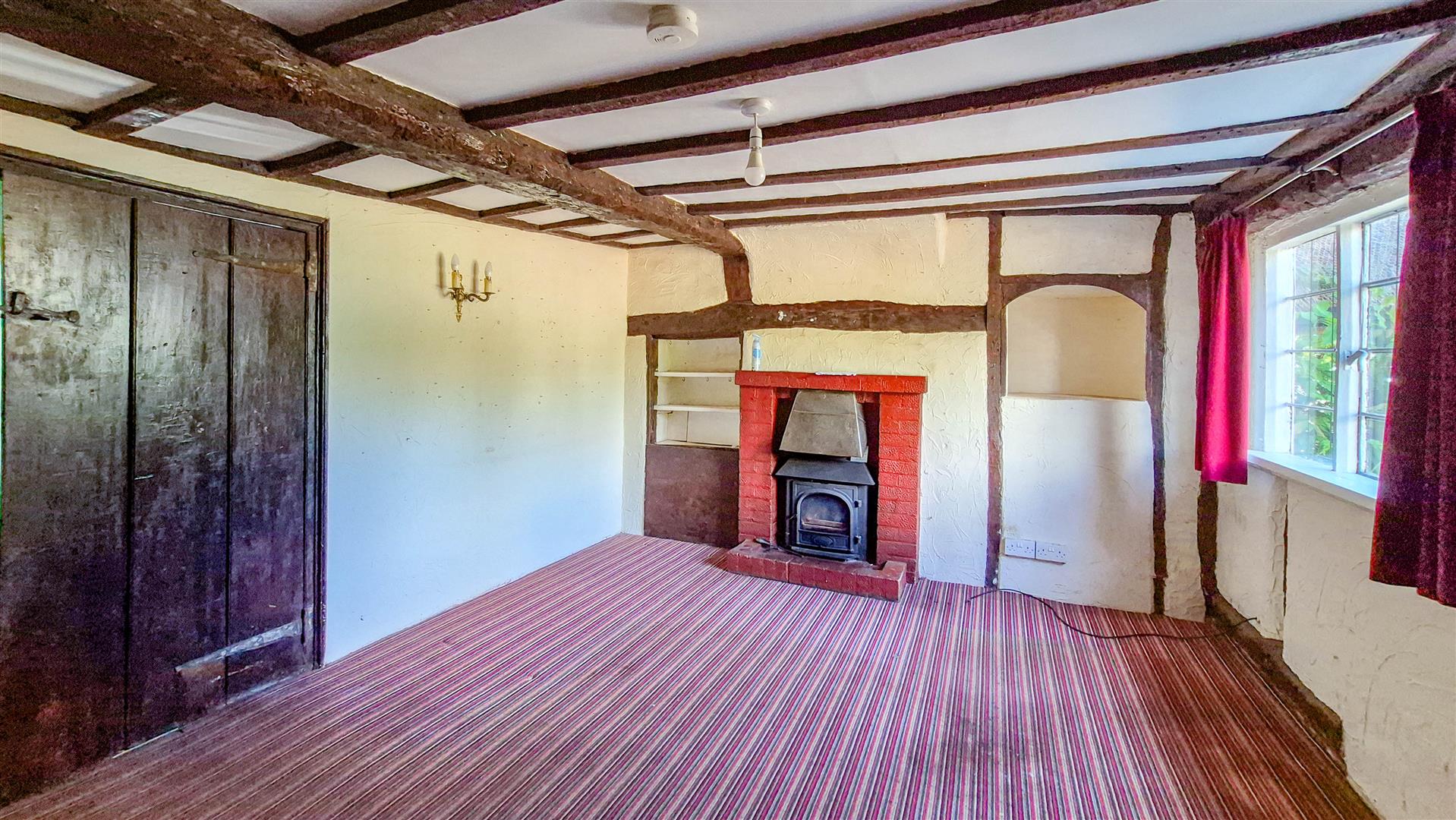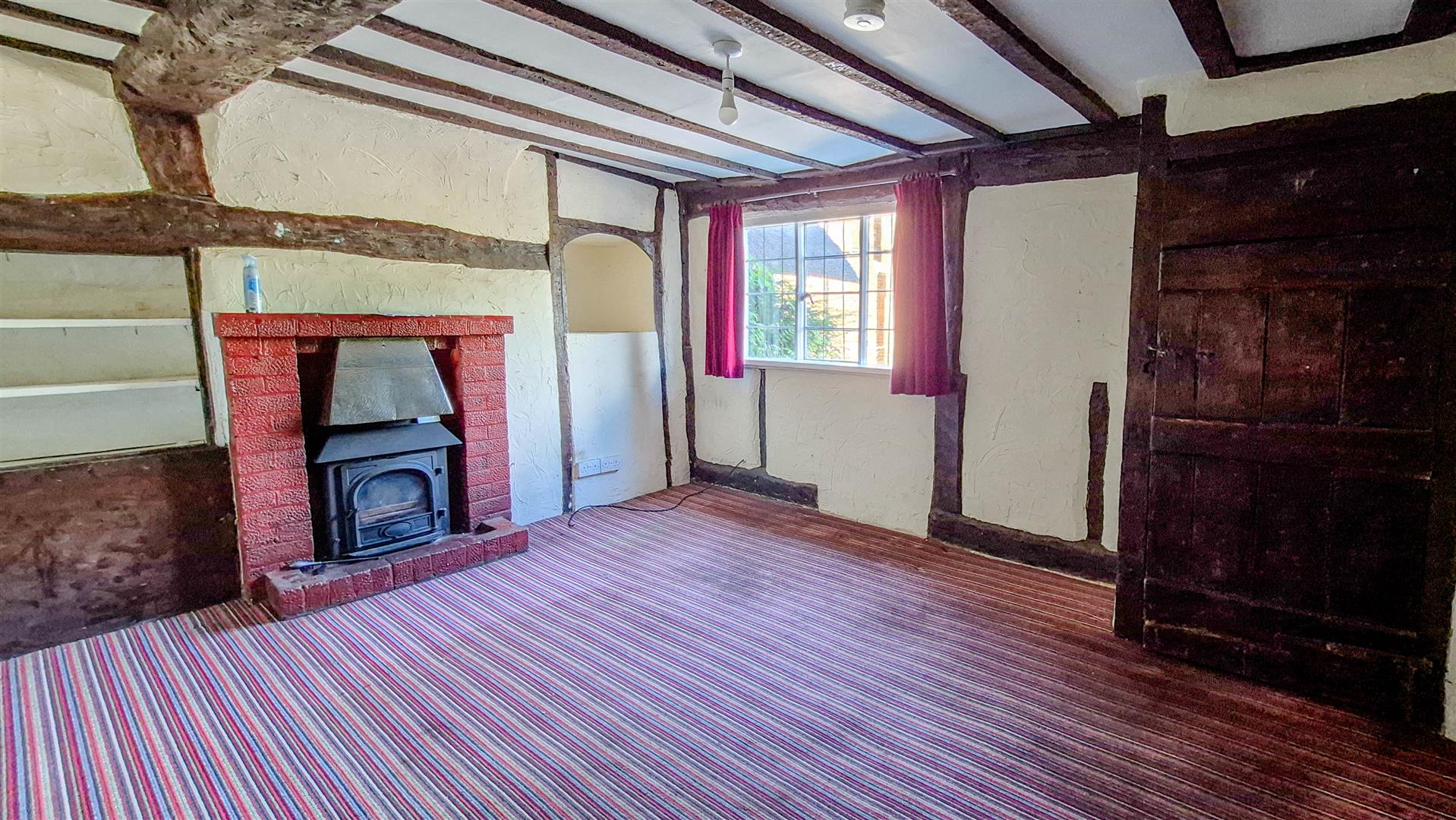 Window to front, cast iron fireplace, exposed beams, vaulted ceiling, door to