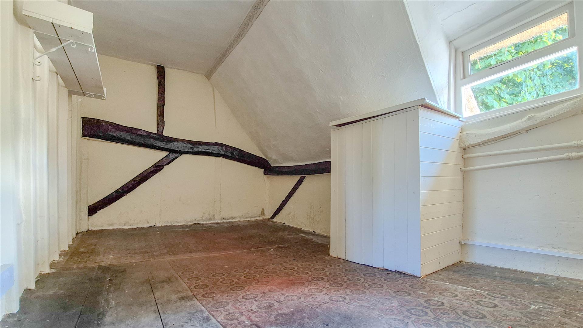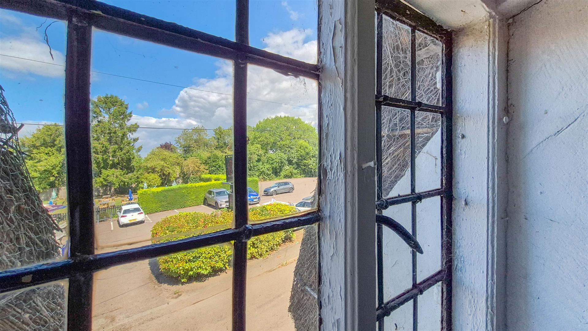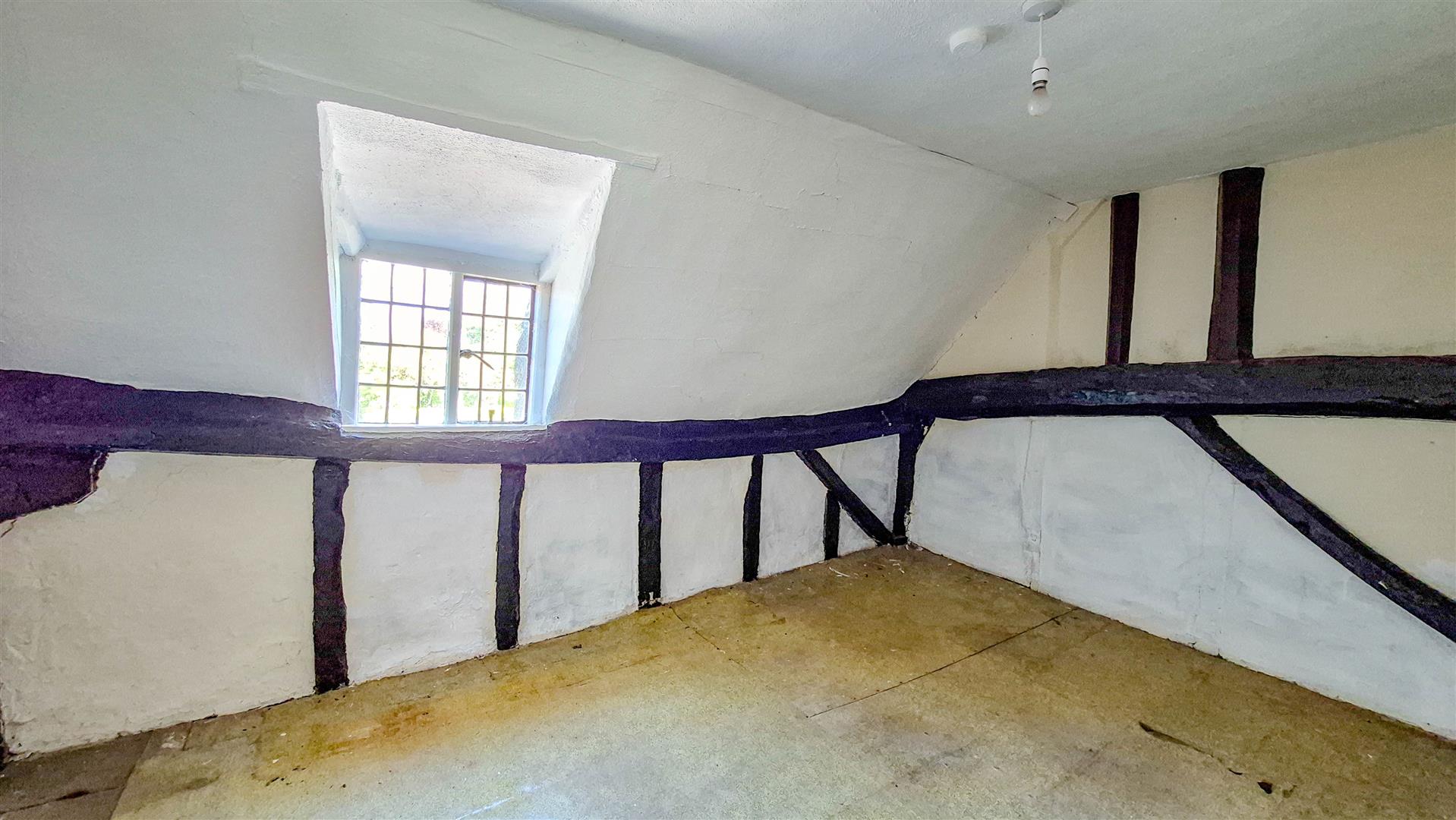 Window to front, cast iron fireplace, exposed beams, vaulted ceiling, door to