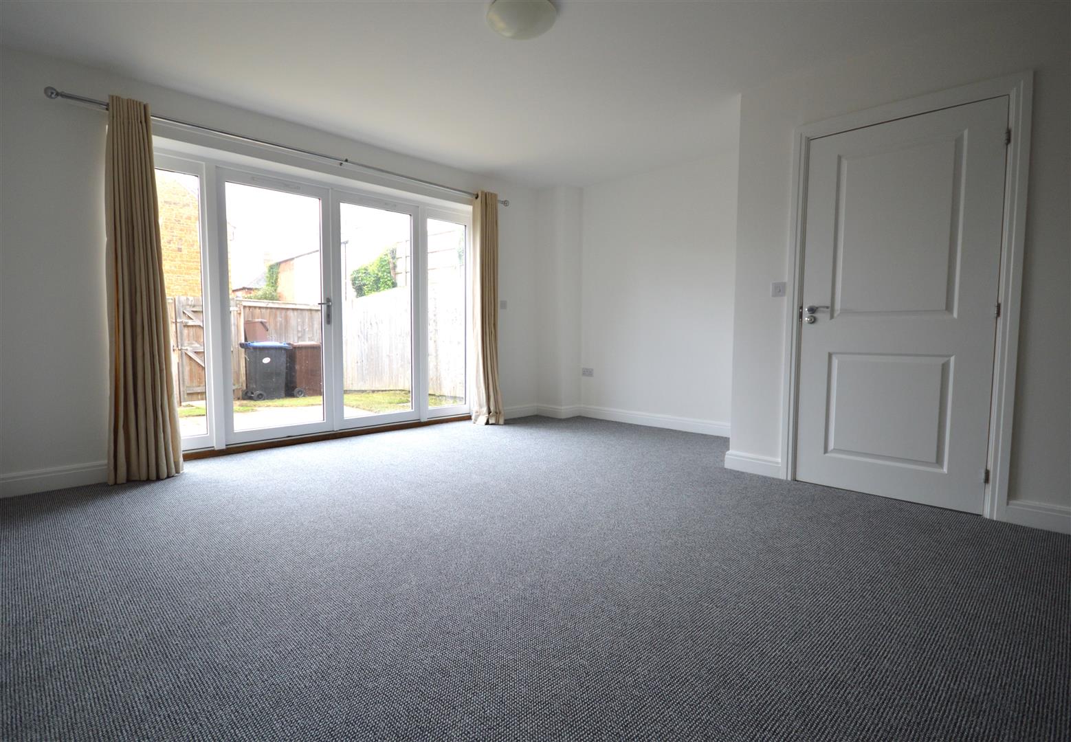 The lounge area features French doors opening onto the rear garden, which includes a patio, lawn, shed, and a pedestrian gate providing access to the two allocated parking spaces on Manor Road. From the entrance hall, there is access to two further bedrooms and the family bathroom. Bedroom two benefits from mirror-fronted fitted wardrobes, while the bathroom includes a shower over the bath with a glazed screen, WC, basin, heated towel rail, and tiled floor.