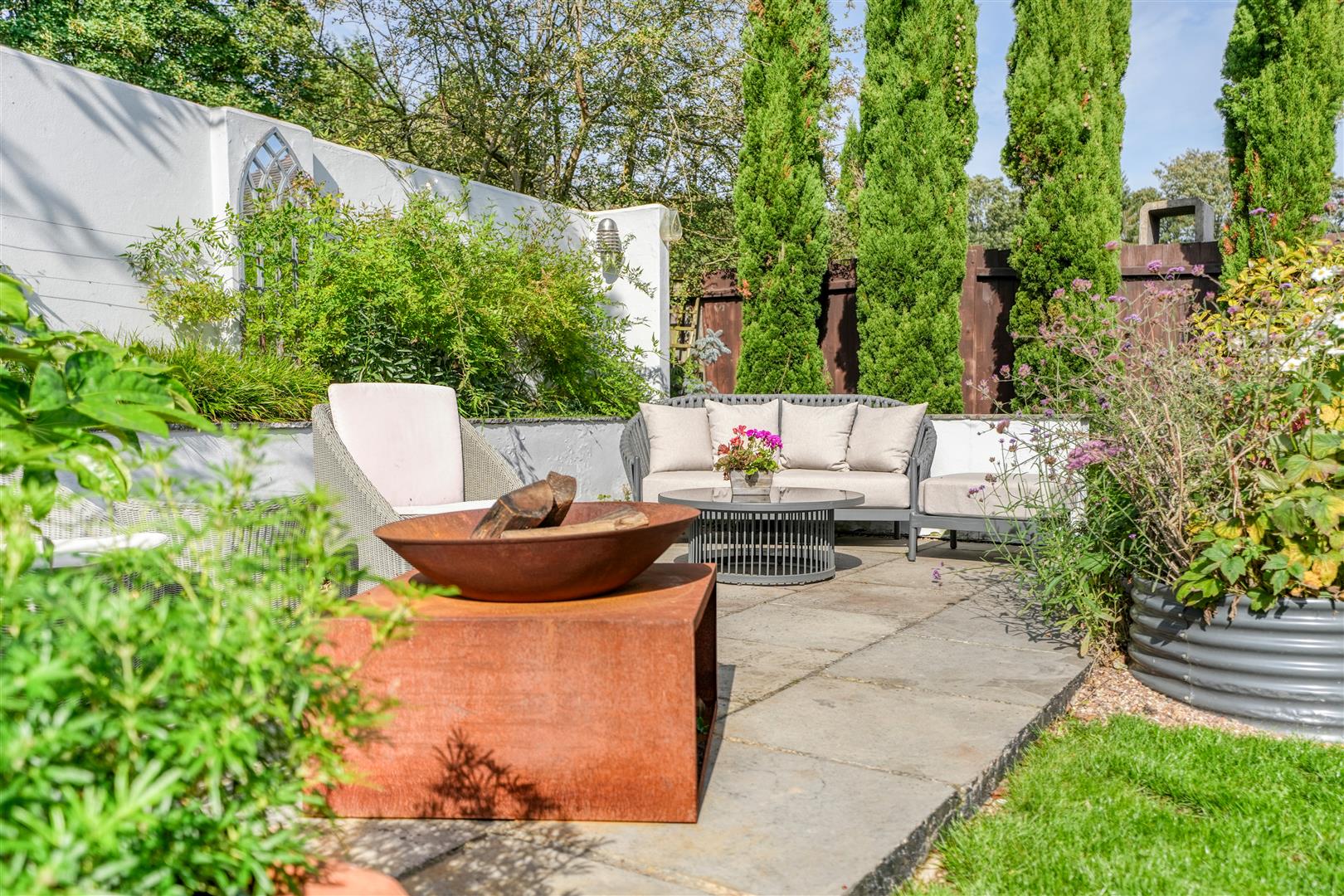 Approached by an Indian limestone terrace the rear garden is landscaped and partly laid to lawn together with an attractive seating area standing within a screen wall with planters and looking back towards the house. The terrace leading from the kitchen gives access to a barbeque logia with retractable side screens and roof and which is served by external power points. The rear garden gives an excellent degree of privacy and backs onto a neighbouring garden.