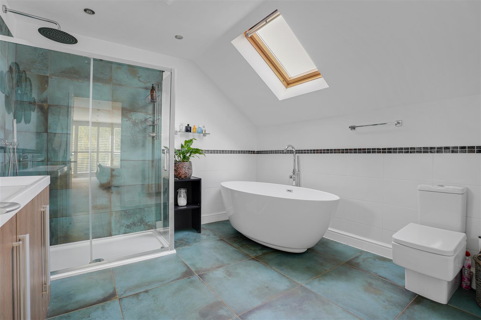 With a twin ended bath with side mixer tap/shower, twin vanity wash basins, glazed rain shower suite, WC with concealed cistern.