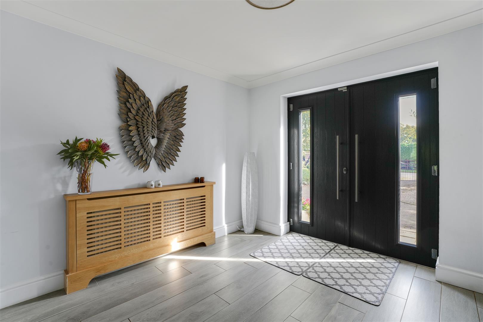 A very spacious room with a statement wall, shuttered picture windows to the front elevation together with integrated sliding blinds, bi-folding doors to the rear garden and the focal point is the circular glass fronted cast iron log burner which stands on a ceramic tiled hearth.