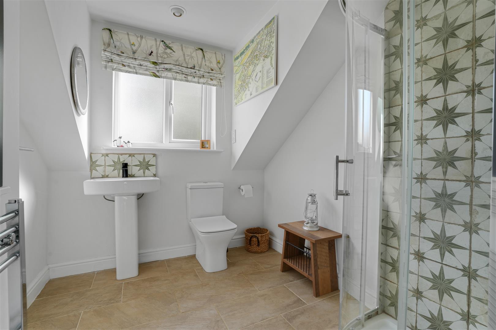 With a quadrant shower cubicle, pedestal wash basin, WC and vertical heated towel rail. There is a two casement dormer window to the front elevation.