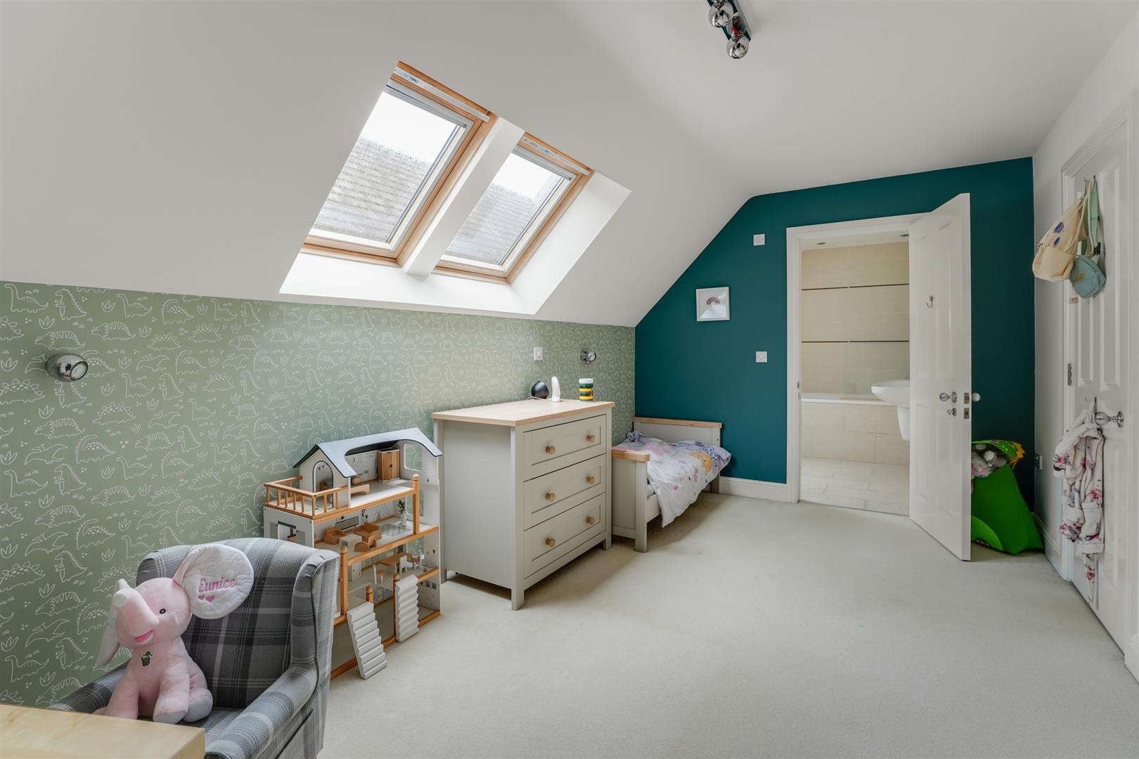 Twin Velux roof lights, wardrobes and statement wall. This room also has a black board wall and a door to:-