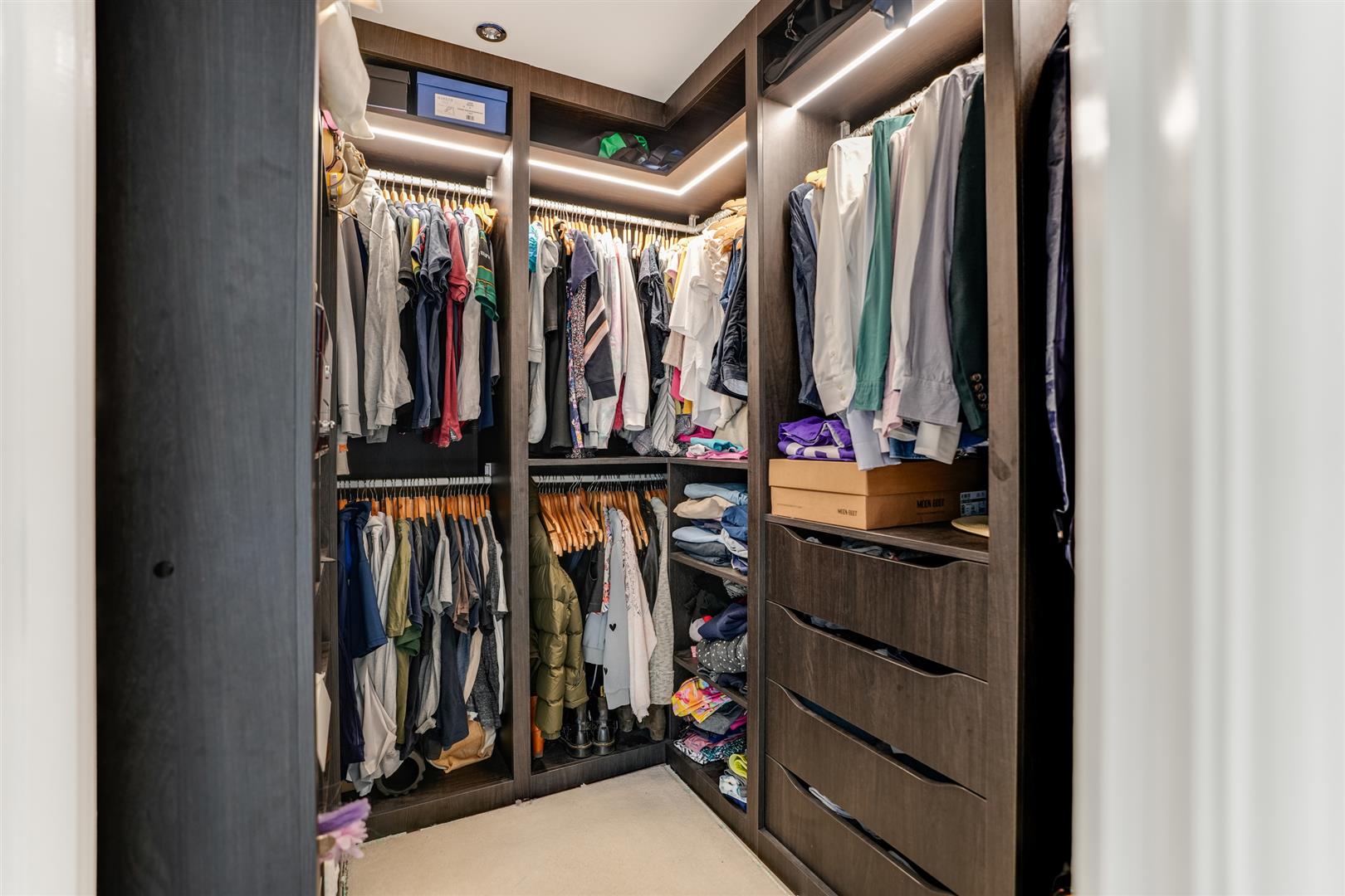 Fully fitted with an extensive range of open fronted shelving and hanging space including a chest of drawers.