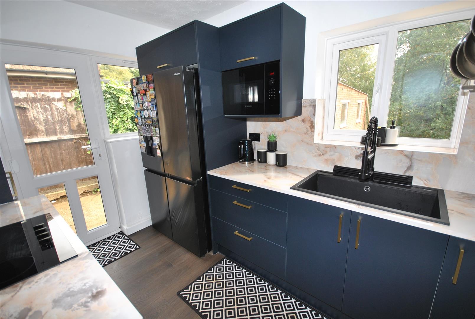 A re-fitted range of base and eye level units, modern worktops and splashbacks, Halogen electric hob and extractor, large modern sink with modern mixer tap, space for an American fridge/freezer, built in microwave, built in bin and spice rack, gas wall mounted combination boiler housing cupboard, UPVC double glazed window to the rear and UPVC double glazed door to the side.