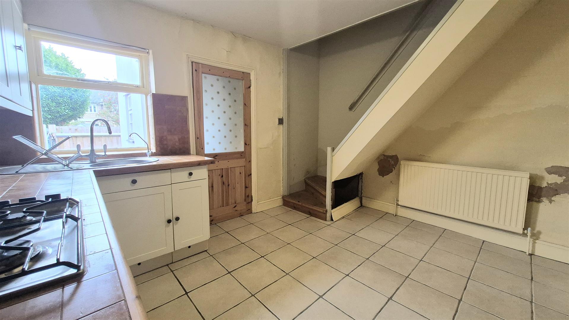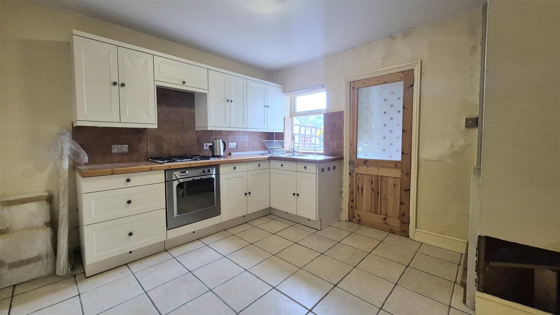 Window to rear, range of fitted wall and base units, stainless steel sink unit, integrated oven/hob, space for further appliances, stairs to 1st floor, door to