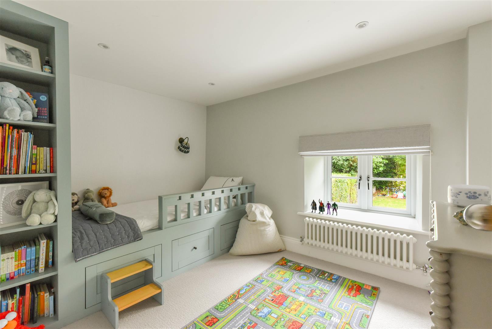 Tastefully decorated for a children's room with space for a single bed, there is wood panelling to the walls, spotlights to the ceiling with carpet fitted and a two casement window to the front elevation with column radiator below.