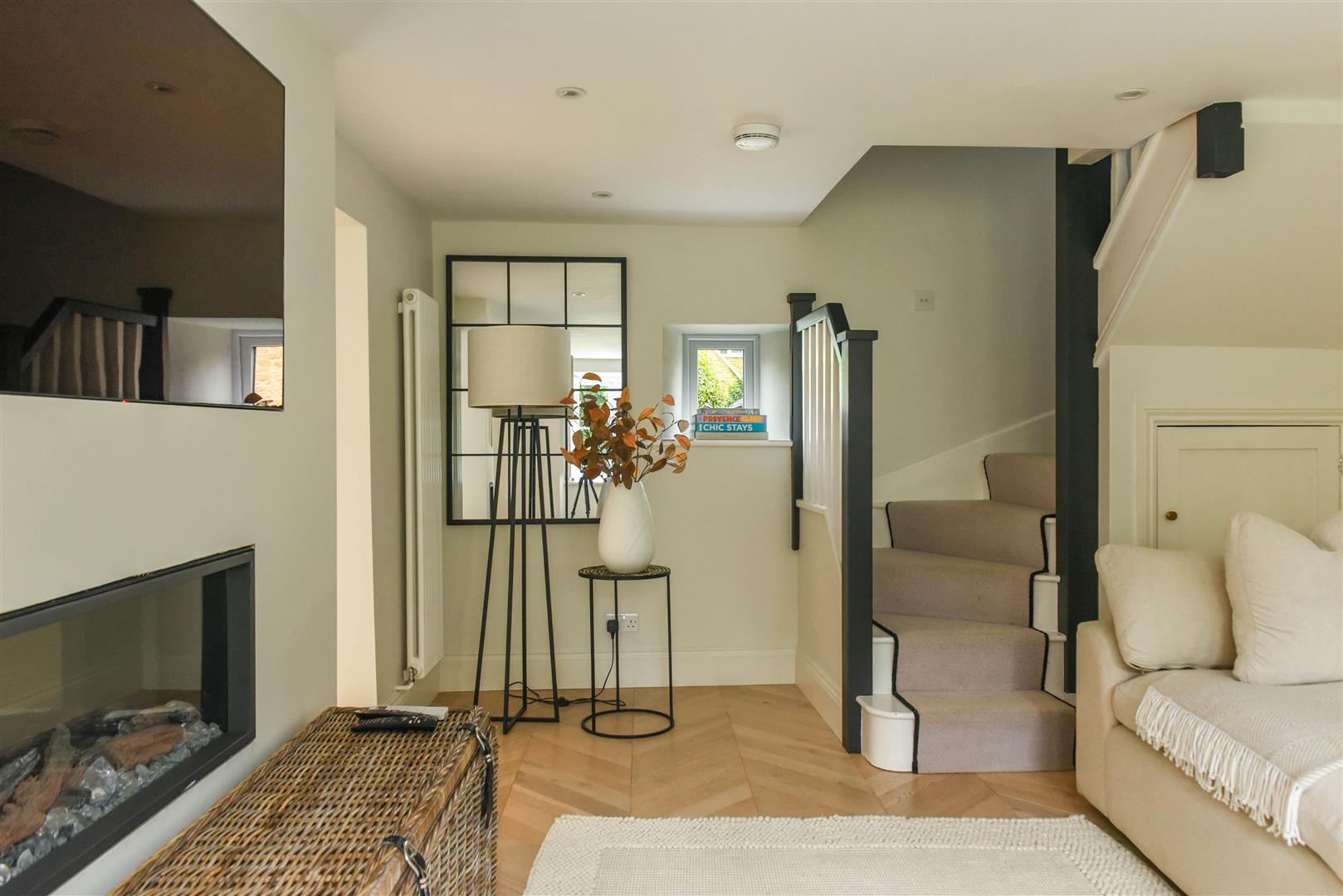 Entered via a solid oak, part-glazed front door, the property opens into a welcoming living area featuring beautiful engineered oak floorboards and ceiling spotlights. This room has been fully refurbished, including replastered walls, a new ceiling, updated skirting boards, modern heating, and fresh decoration throughout. There is useful under-stairs storage, with a staircase rising to the first floor. Natural light floods the space through a rear window and a triple-casement window to the front elevation. A wall-mounted TV point is neatly integrated above a contemporary feature fireplace with a heated insert below. On either side of the fireplace, elegant archways lead through to: