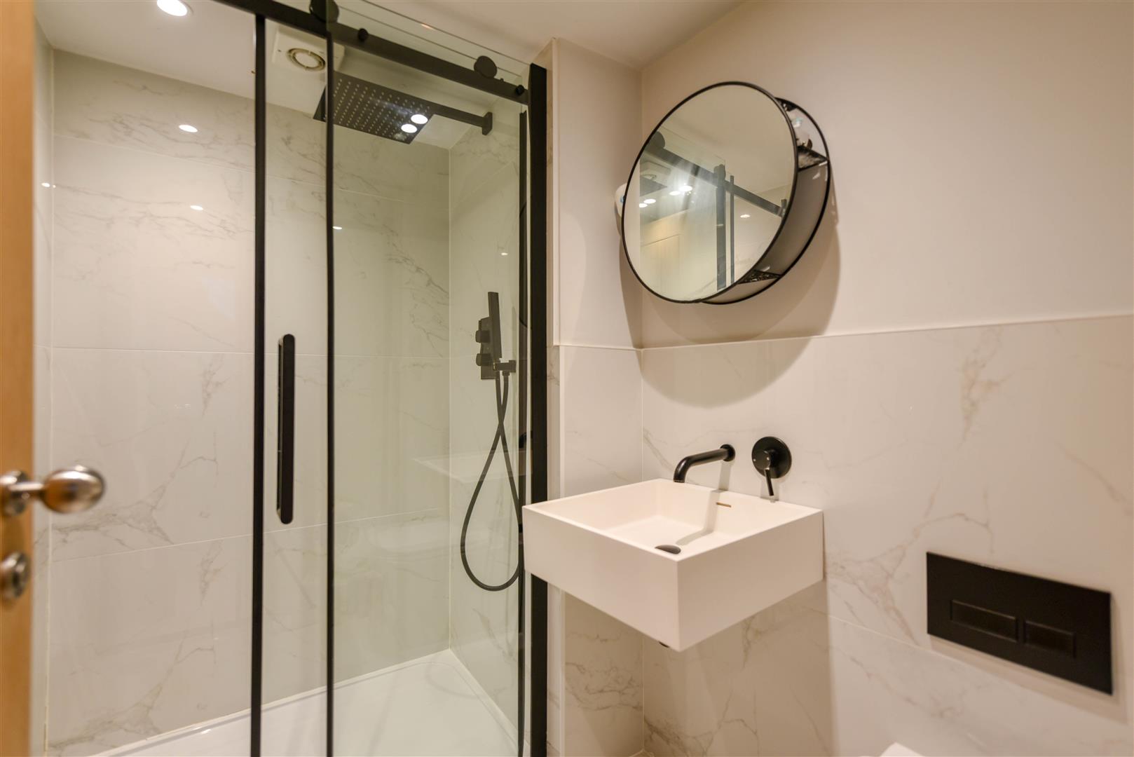 Suite comprising of double shower cubicle with rain water shower head above and hand held shower attachment, fully tiled with Corian wall hung sink, WC, half tiled walls with extractor and spotlights above.