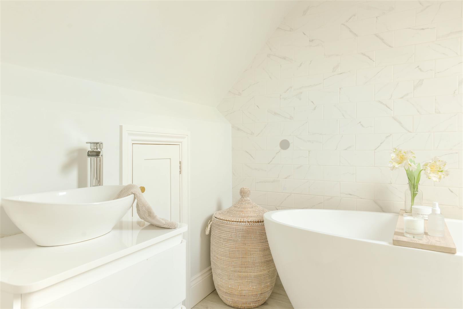 Suite comprising of freestanding bath with tiled walls and floor with WC, wash hand basin, Velux window to the front elevation and storage to the eaves.