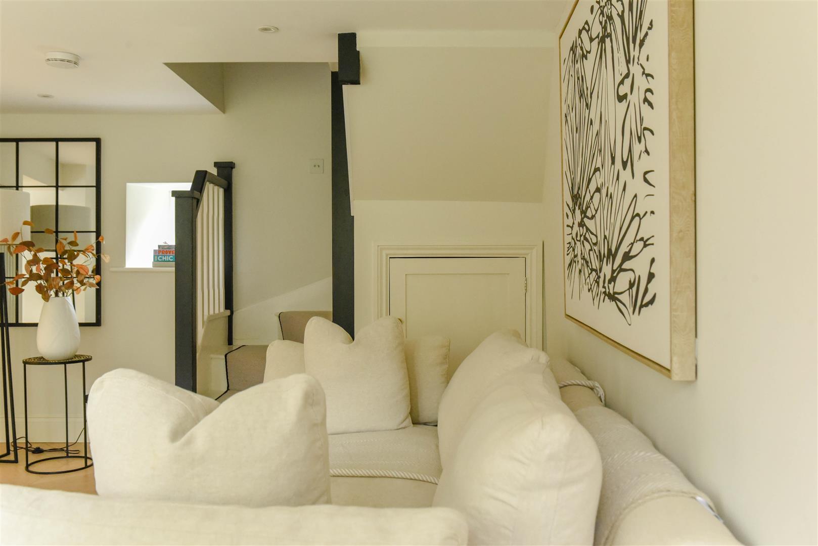 The kitchen has been completely refitted with an extensive range of floor and wall-mounted cabinets, complemented by granite worktops with matching upstands and splashbacks. Integrated appliances include a dishwasher, fridge/freezer, and a four-ring gas hob with extractor above, as well as an integrated oven with microwave positioned conveniently to the side. A classic Belfast sink enjoys a pleasant outlook through a three-casement front window fitted with shutters, while a further three-casement window to the rear elevation features a charming window seat beneath. The room is tastefully decorated and offers ample space for a breakfast table, with a radiator providing additional comfort. Steps lead back through to the living room, maintaining a seamless flow throughout the ground floor.