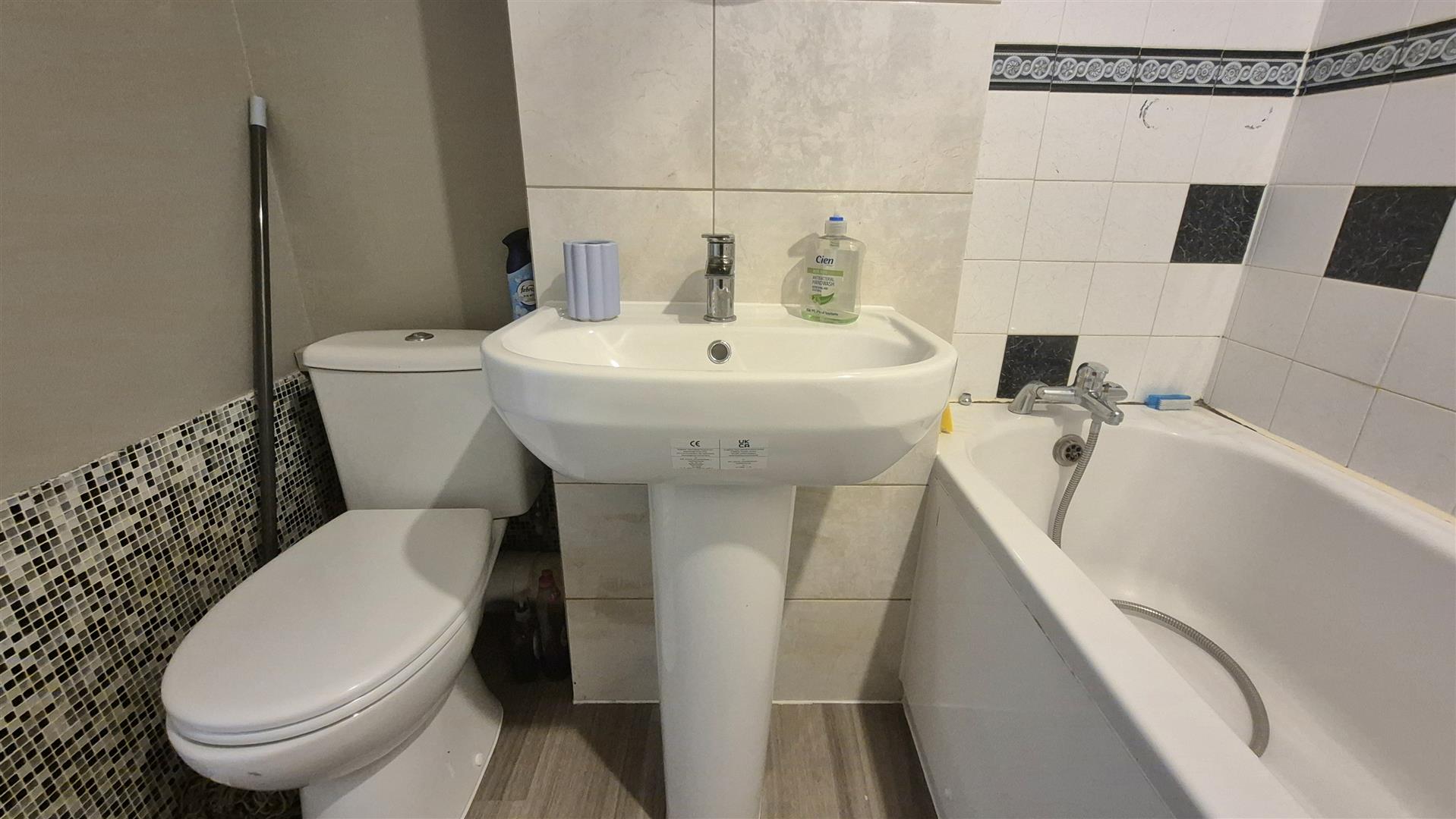 With bath with shower/mixer tap, sink unit, WC, part tiled walls, extractor fan, heated towel rail.