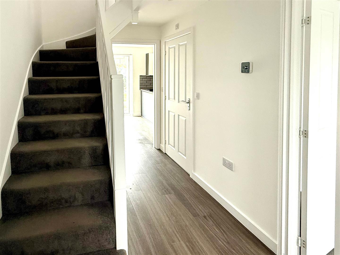 Accessed via the main front door, with stairs rising to the first-floor landing and a useful storage cupboard.