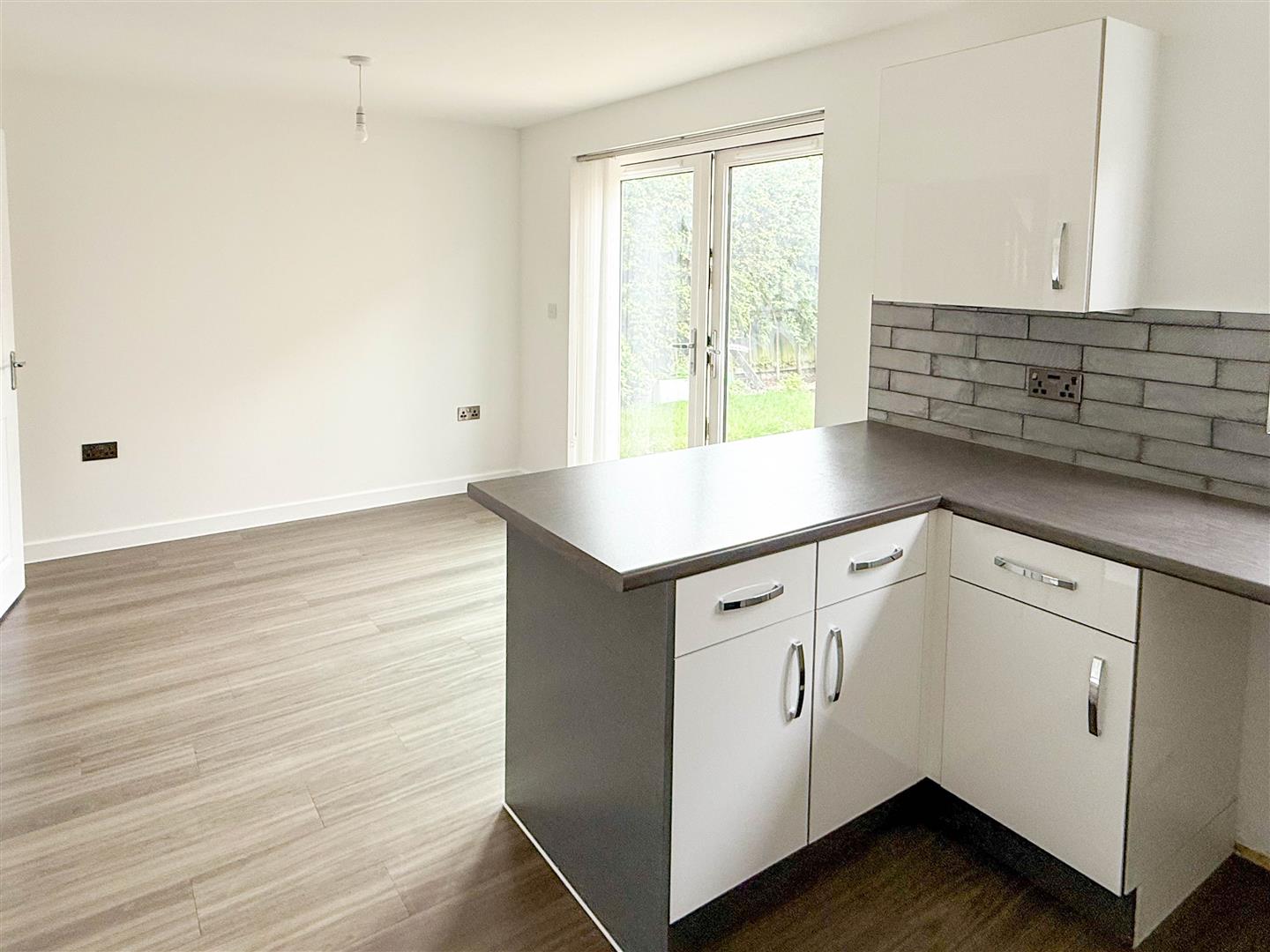 Fitted with a range of floor and wall cabinets complemented by contrasting work surfaces and tiled splashbacks. Features include a sink with mixer tap, integrated oven, inset hob with extractor hood, fridge and freezer and space for dining. French doors open directly to the rear garden.